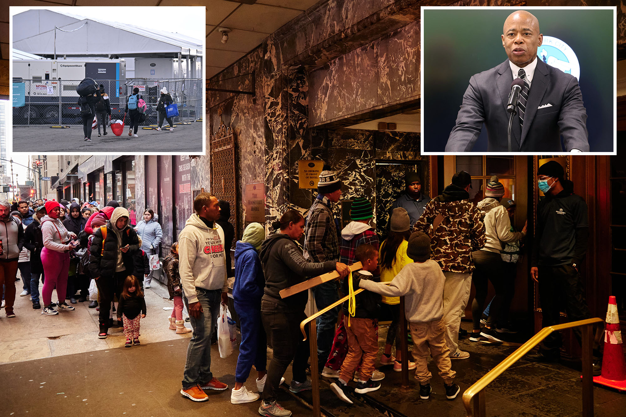 Migrants gather gather outside the Roosevelt Hotel, the cityâÂÂs main intake center, on Friday, December 8, 2023 in New York, N.Y. (James Keivom for New York Post)