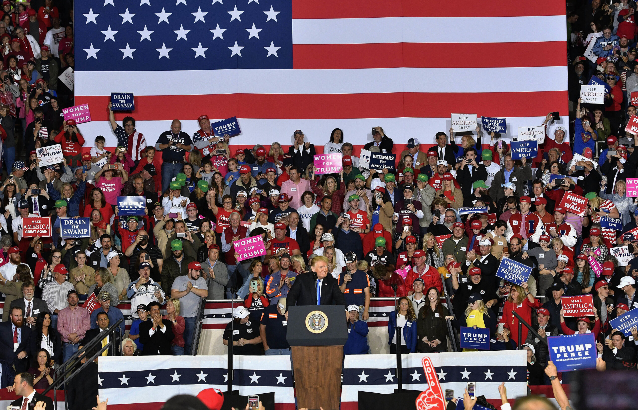 President Donald Trump speaks to a cheering crowd at Eastern Kentucky University, Saturday, Oct. 13, 2018, in Richmond, Ky. (AP Photo/Timothy D. Easley)